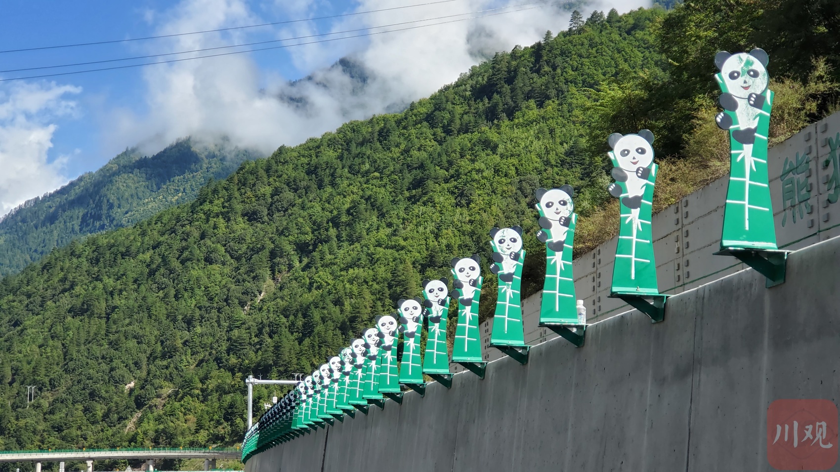 試跑時記者觀察到,整條高速大熊貓“含量”極高,生態氣息撲面而來。在白馬隧道口,憨態可掬的大熊貓雕像坐在高速中間,舉著手給過往車輛“打招呼”;平武互通出入口整體設計為大熊貓造型,與平武“天下大熊貓第一縣”的稱號對應。