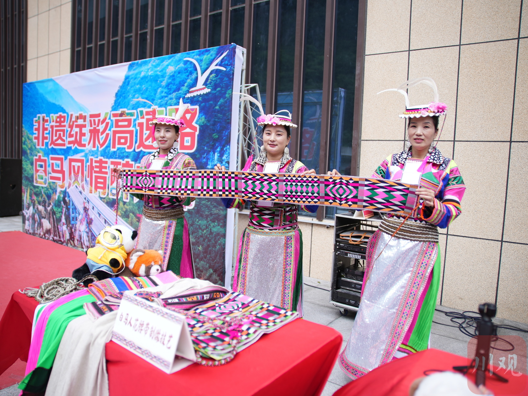 除了自然風光,文化體驗也同樣豐富。在平武縣木座服務區,白馬藏族文化元素隨處可見,花腰帶、白氈帽、曹蓋面具……充滿地域特色的產品,仿佛將白馬藏族的古老生活場景生動再現。還有白馬藏族民間舞團獻演,以白羽毛頭飾、白馬藏族服飾為特色,搭配羊皮鼓等傳統樂器現場伴奏,還原了白馬人“火塘邊的歌舞記憶”。